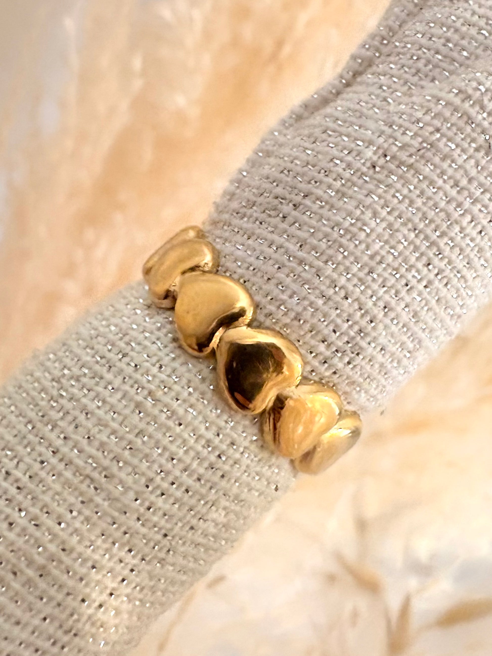 Un bijou délicat et romantique composé de petits cœurs dorés reliés entre eux. Idéale pour exprimer douceur et élégance, cette bague se porte aussi bien seule qu’en accumulation.