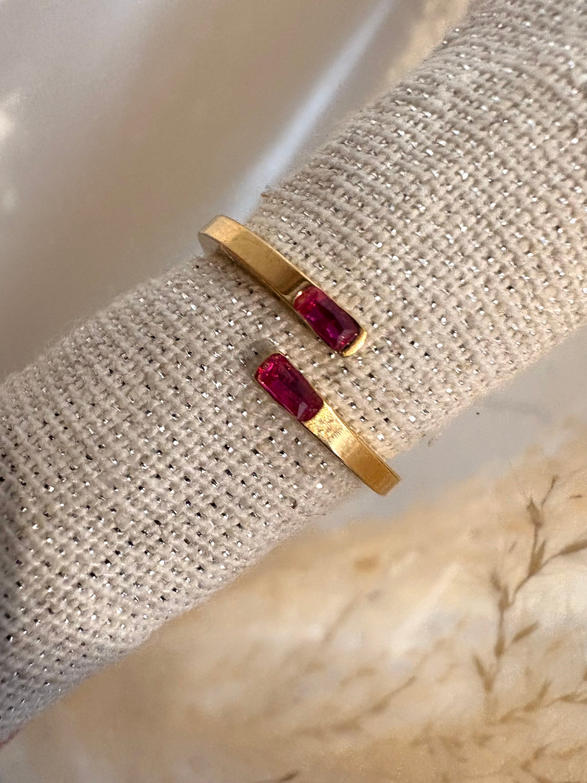 Élégance et couleur s’allient dans cette bague ouverte ornée de deux pierres rectangulaires rouge rubis. Son design minimaliste et sa touche de couleur intense en font un bijou à la fois chic et contemporain.