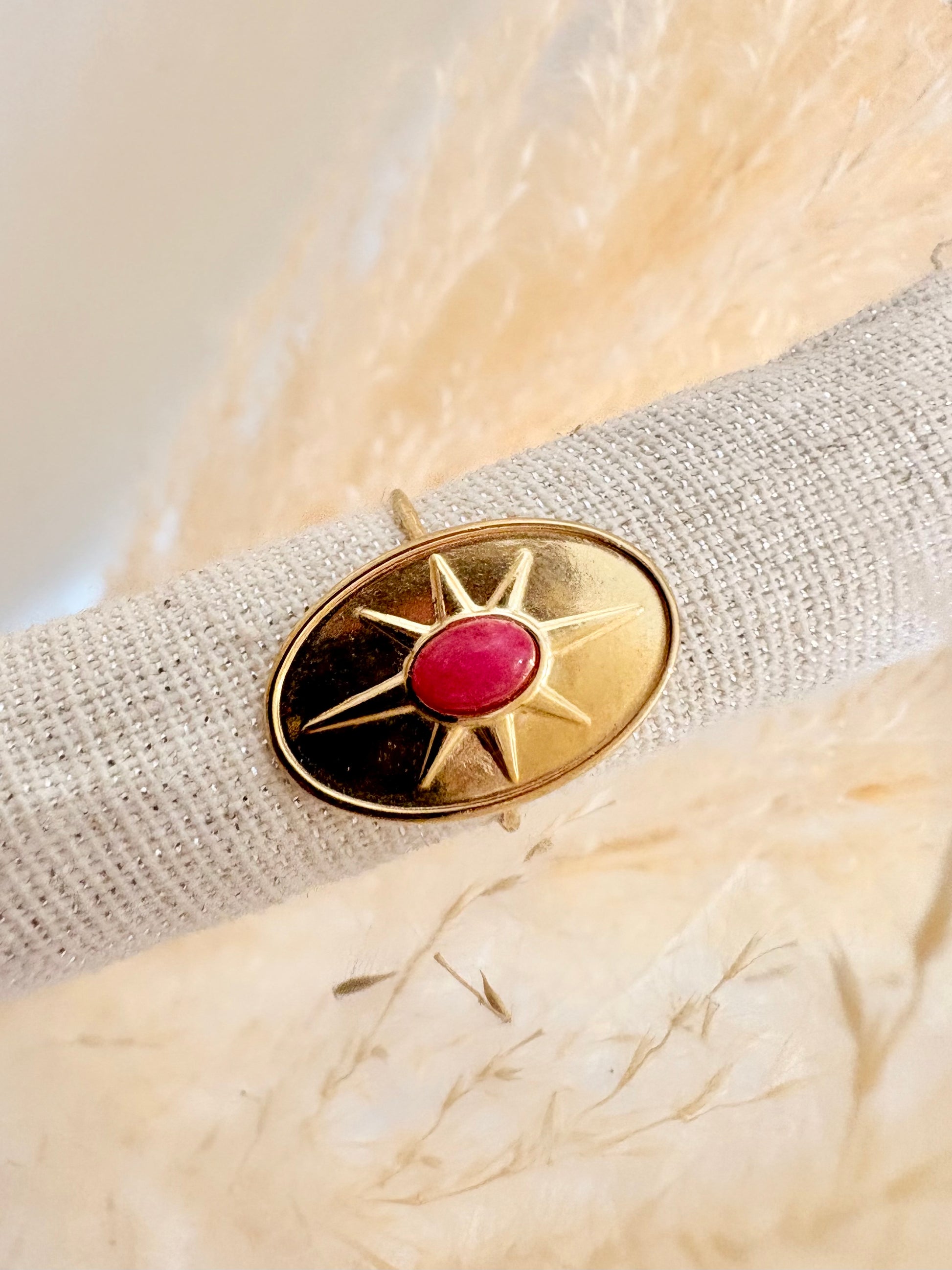Un bijou éclatant inspiré des astres, orné d’un médaillon ovale doré gravé d’un soleil rayonnant, au centre duquel brille une pierre rose. Une pièce forte qui attire la lumière et les regards.