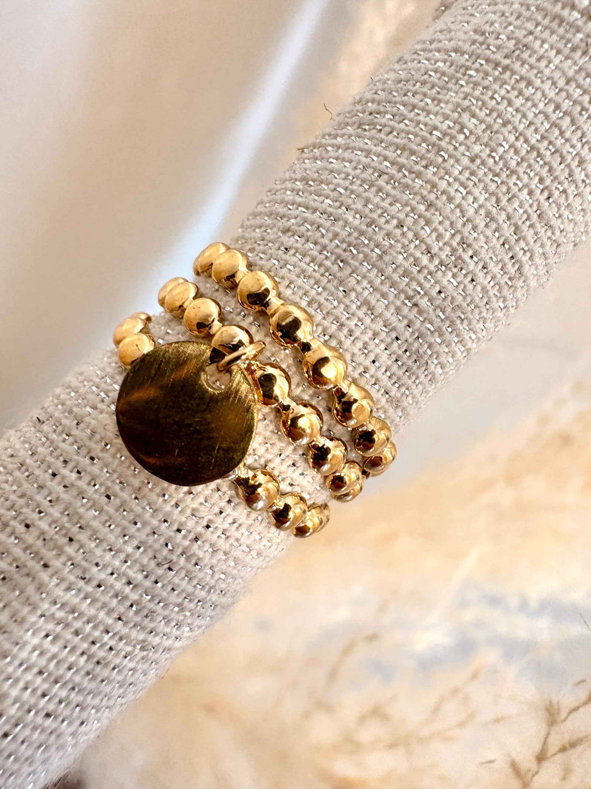 Une bague délicate composée de petites perles dorées en acier inoxydable, agrémentée d’un médaillon rond pour une touche élégante et minimaliste. Elle s’adapte facilement à toutes les tailles.