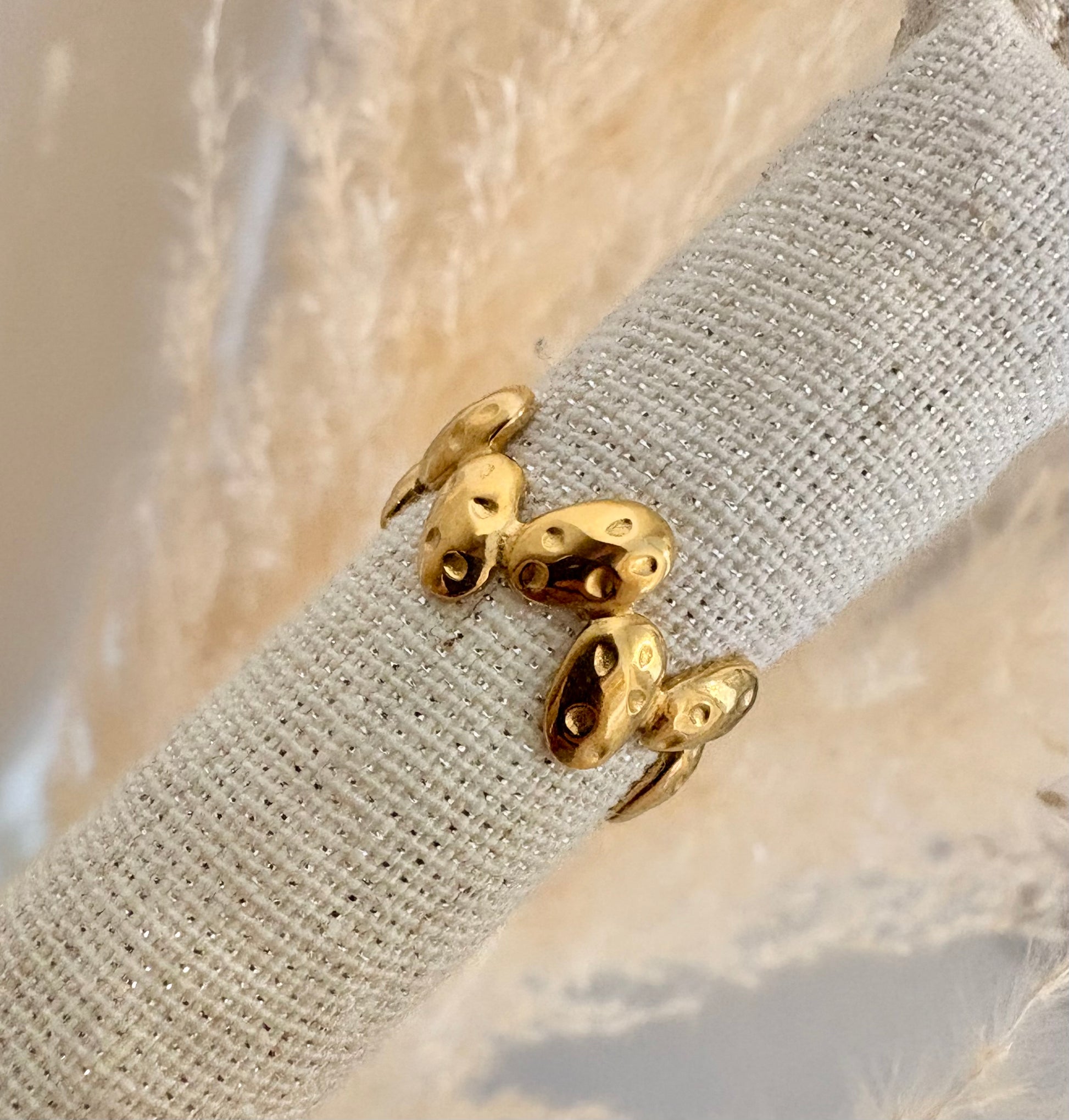 Une bague sculpturale au style naturel, inspirée par les formes irrégulières des galets et bulles d’or. Sa texture douce et ses reliefs uniques en font un bijou artistique et contemporain.