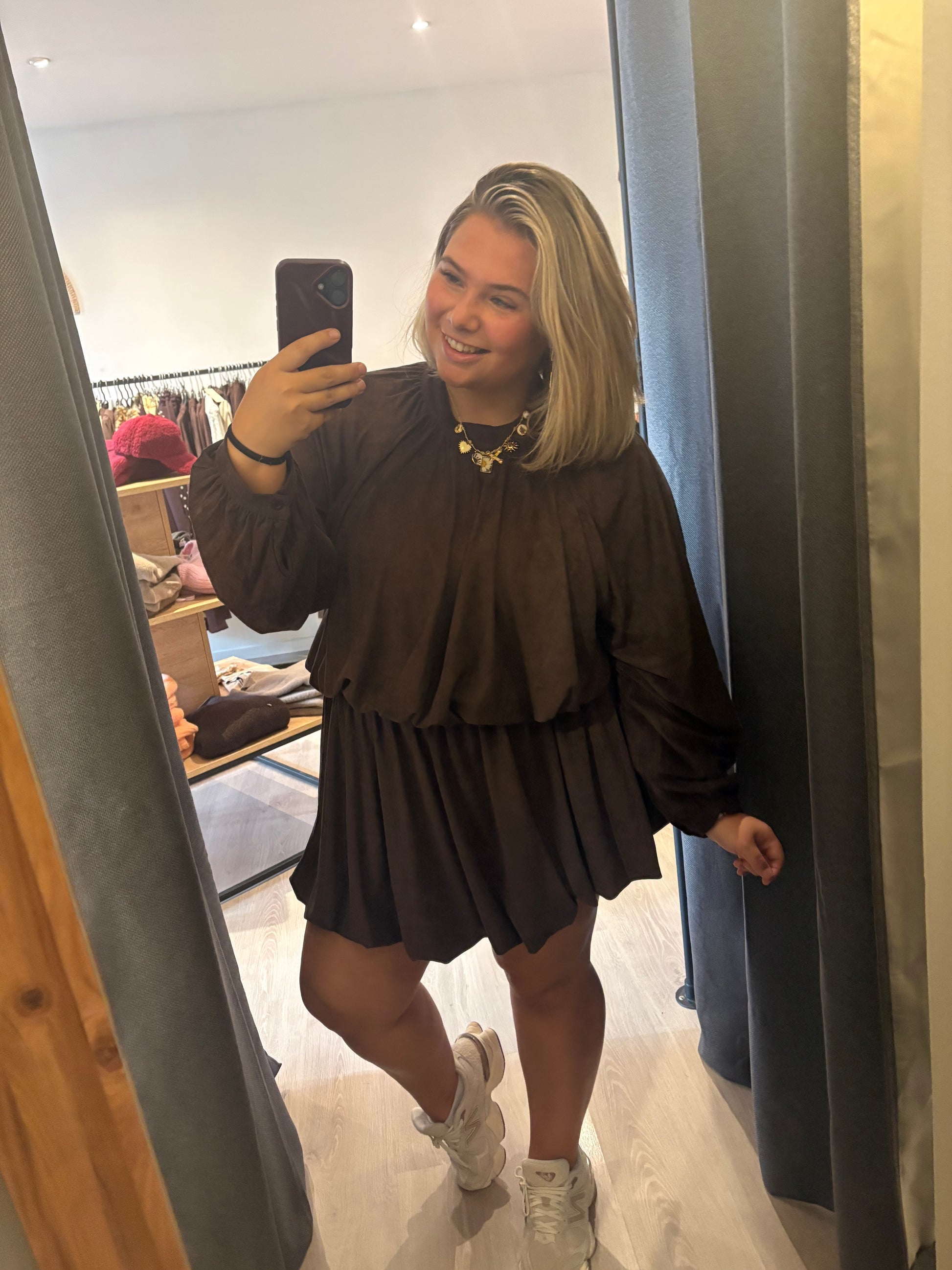 Féminine et confortable, cette robe fluide marron séduit par sa coupe ample et aérienne qui offre un tombé élégant et un confort absolu. Le haut légèrement blousant associé à la jupe plissée apporte du mouvement et met la silhouette en valeur sans la marquer.