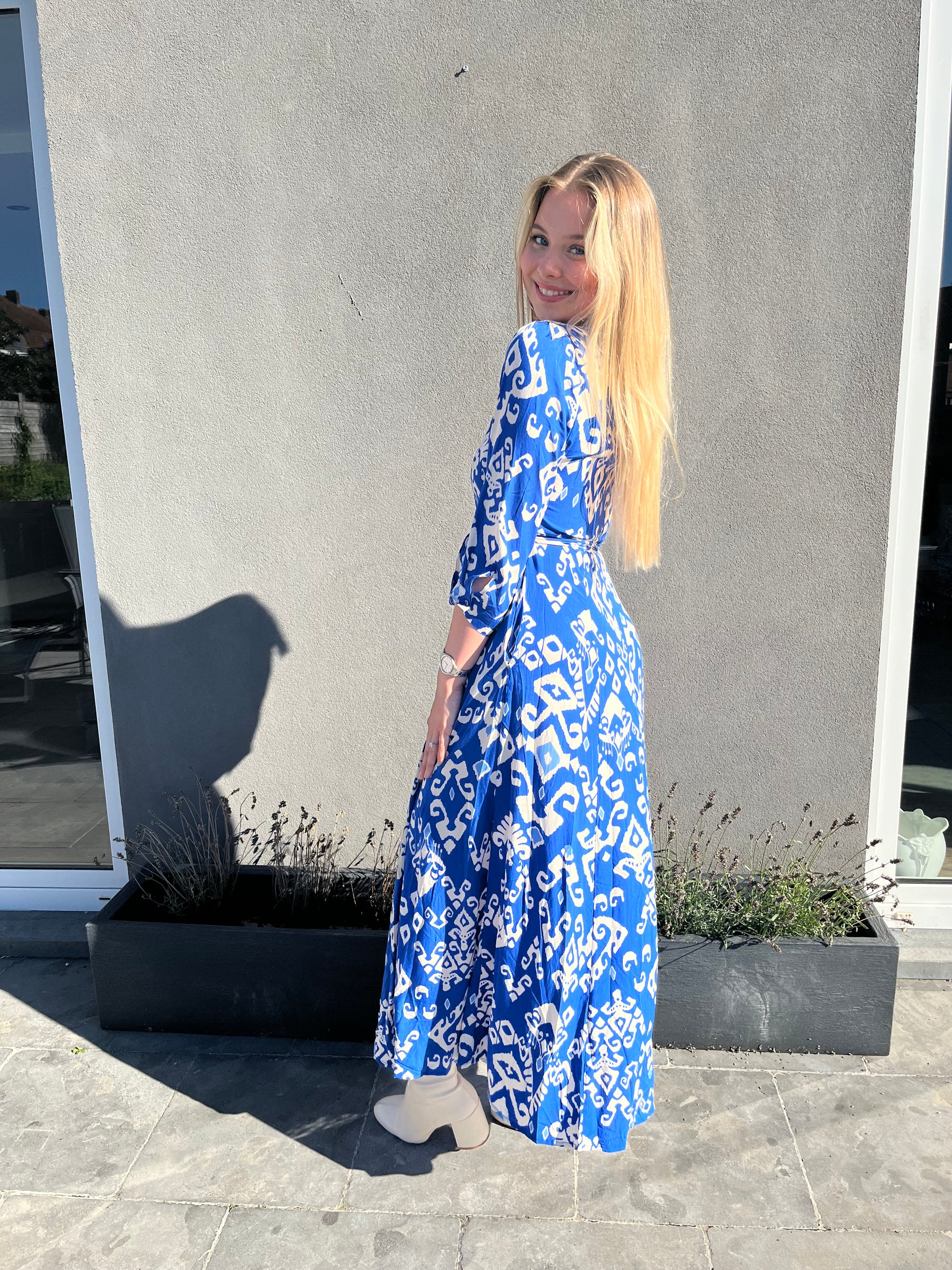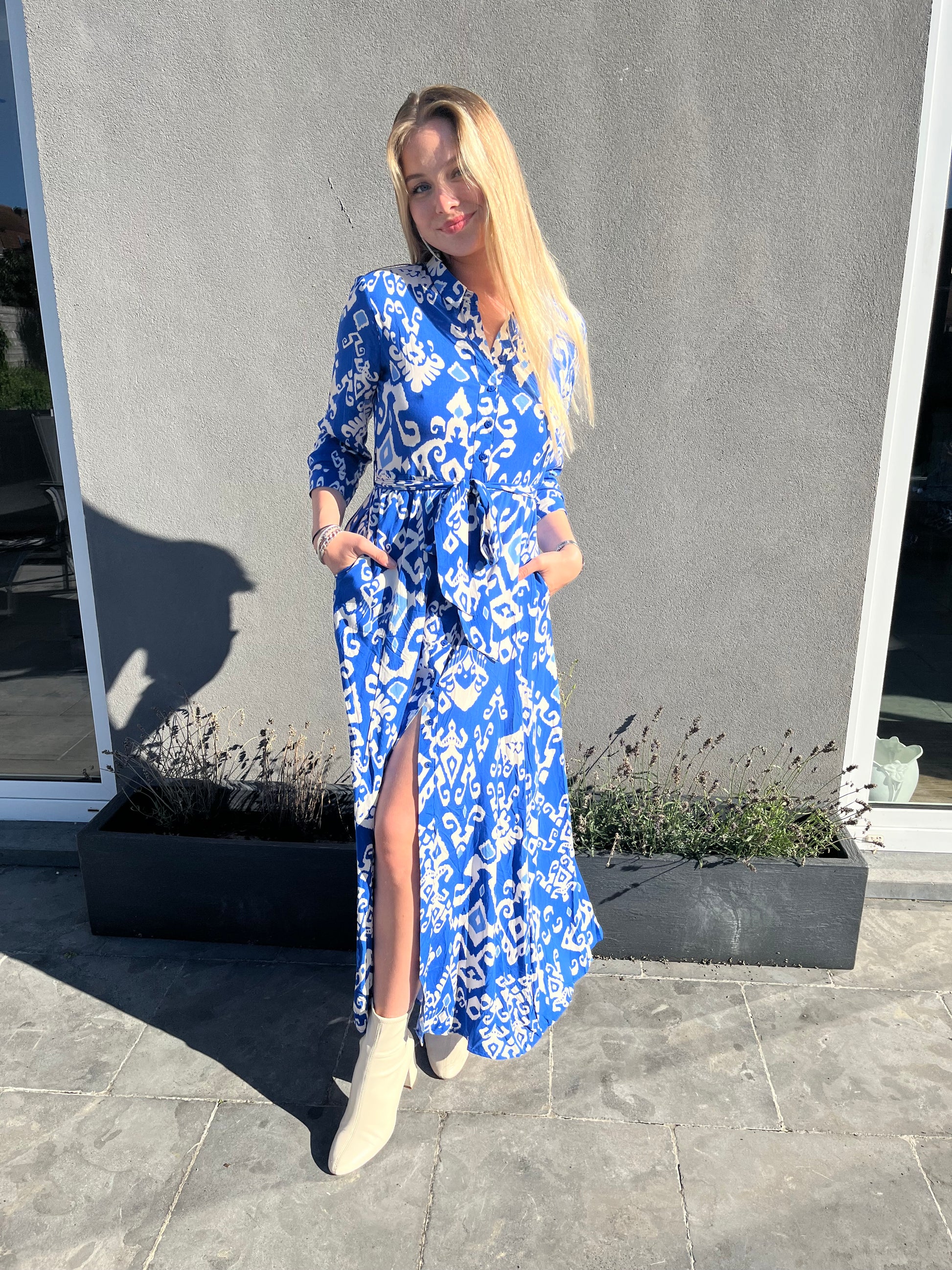 Élégante, fluide et terriblement féminine, cette robe longue imprimée est une pièce forte qui sublime toutes les silhouettes. Son motif bleu royal sur fond blanc attire l’œil, tandis que sa coupe boutonnée et fendue allie confort et sensualité. Une robe qui tourne et qui fait tourner les têtes !