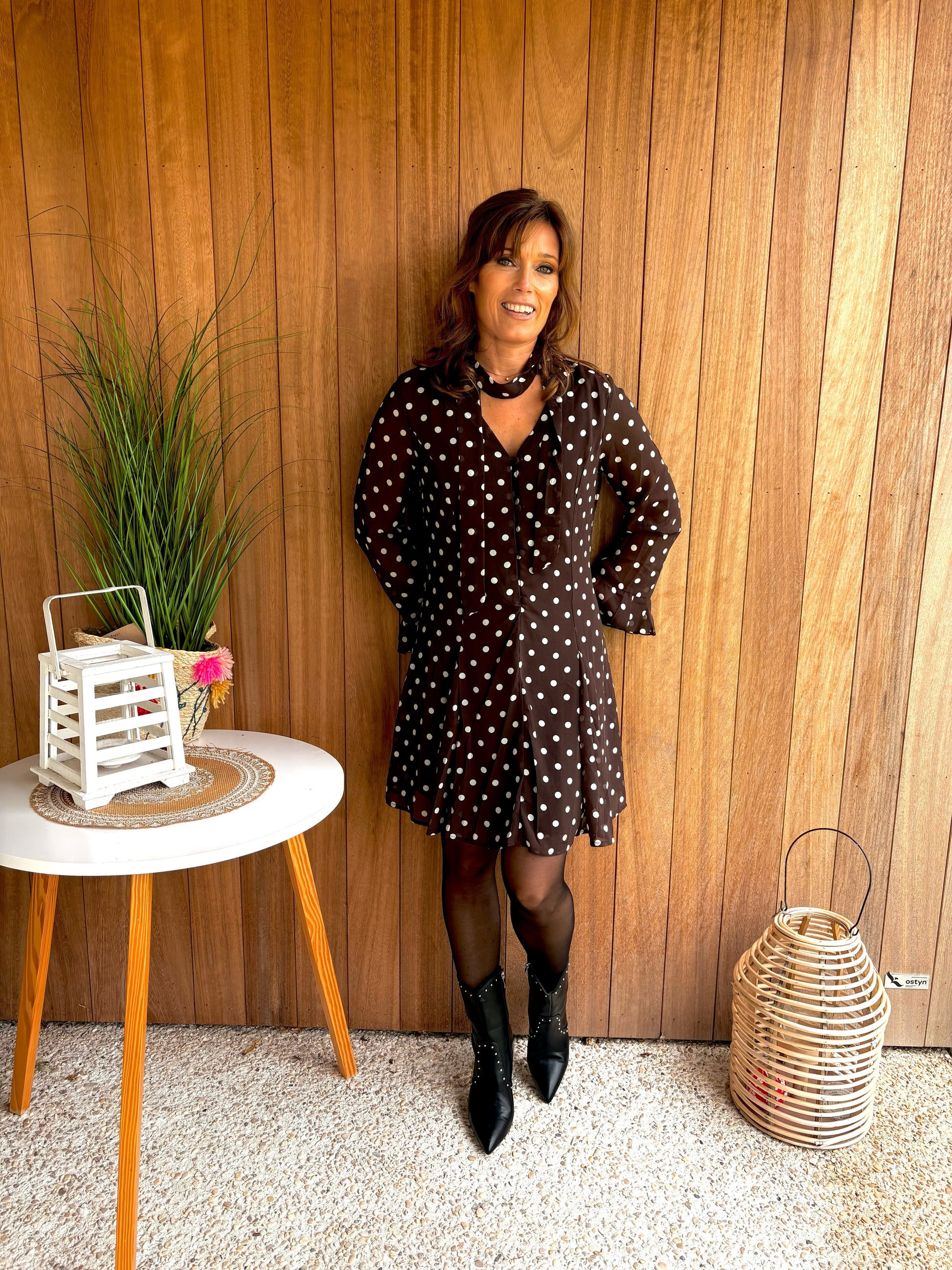 Ajoutez une touche de charme à votre garde-robe avec notre robe à pois chocolat, disponible en tailles S, Met L.