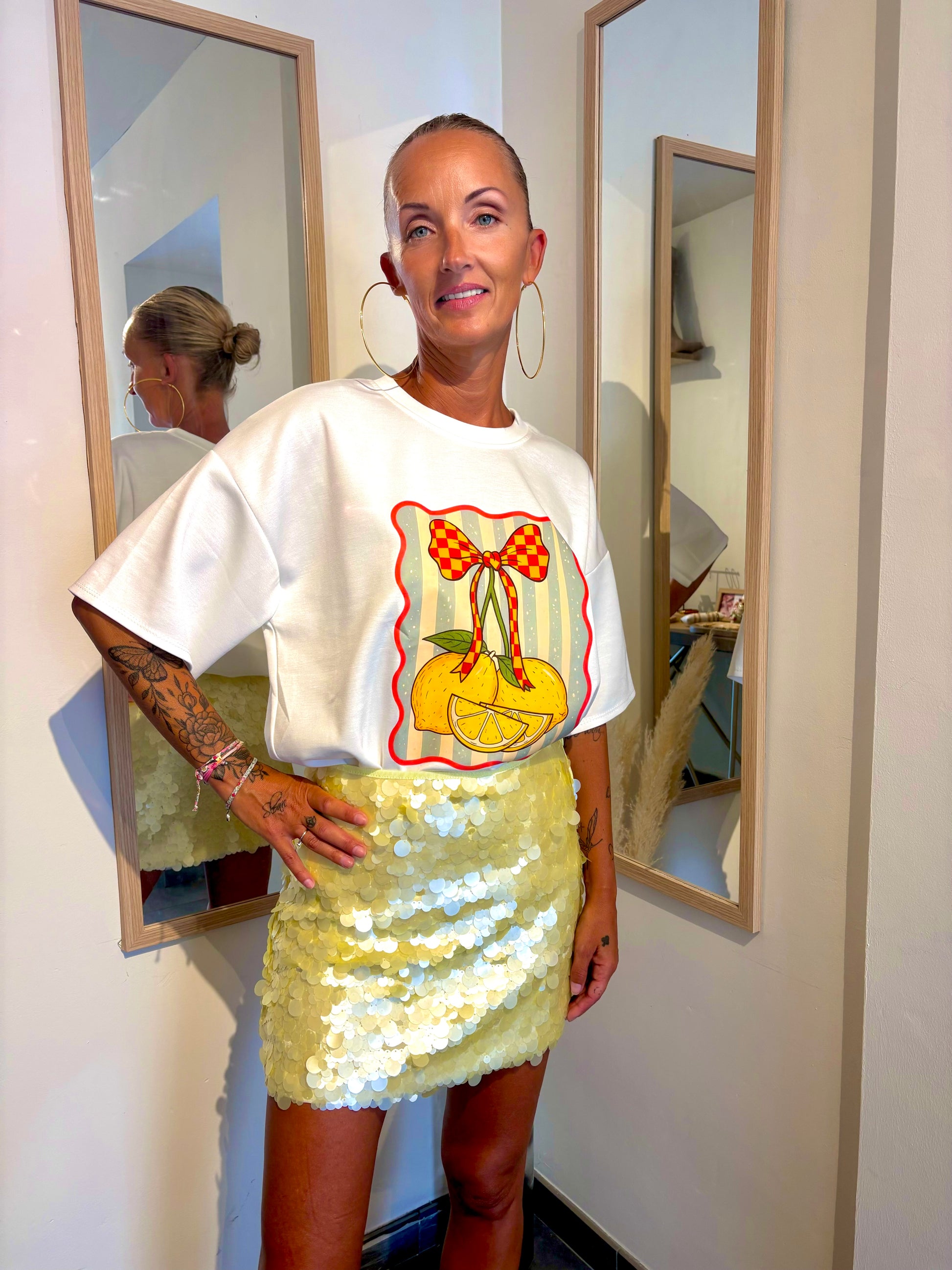 Ajoutez une touche de fraîcheur et de fun à vos tenues avec ce t-shirt à motif citrons et nœud coloré.
