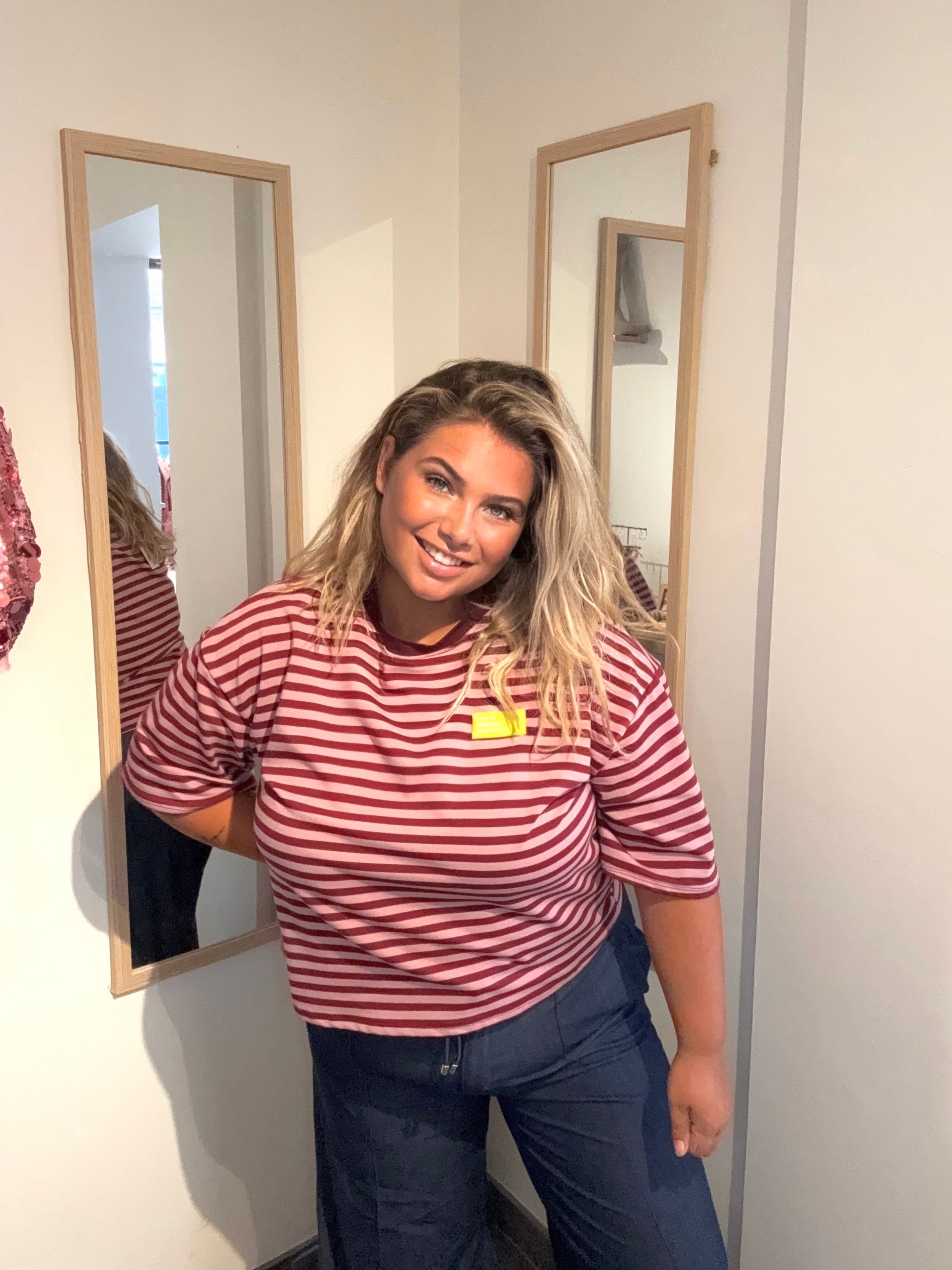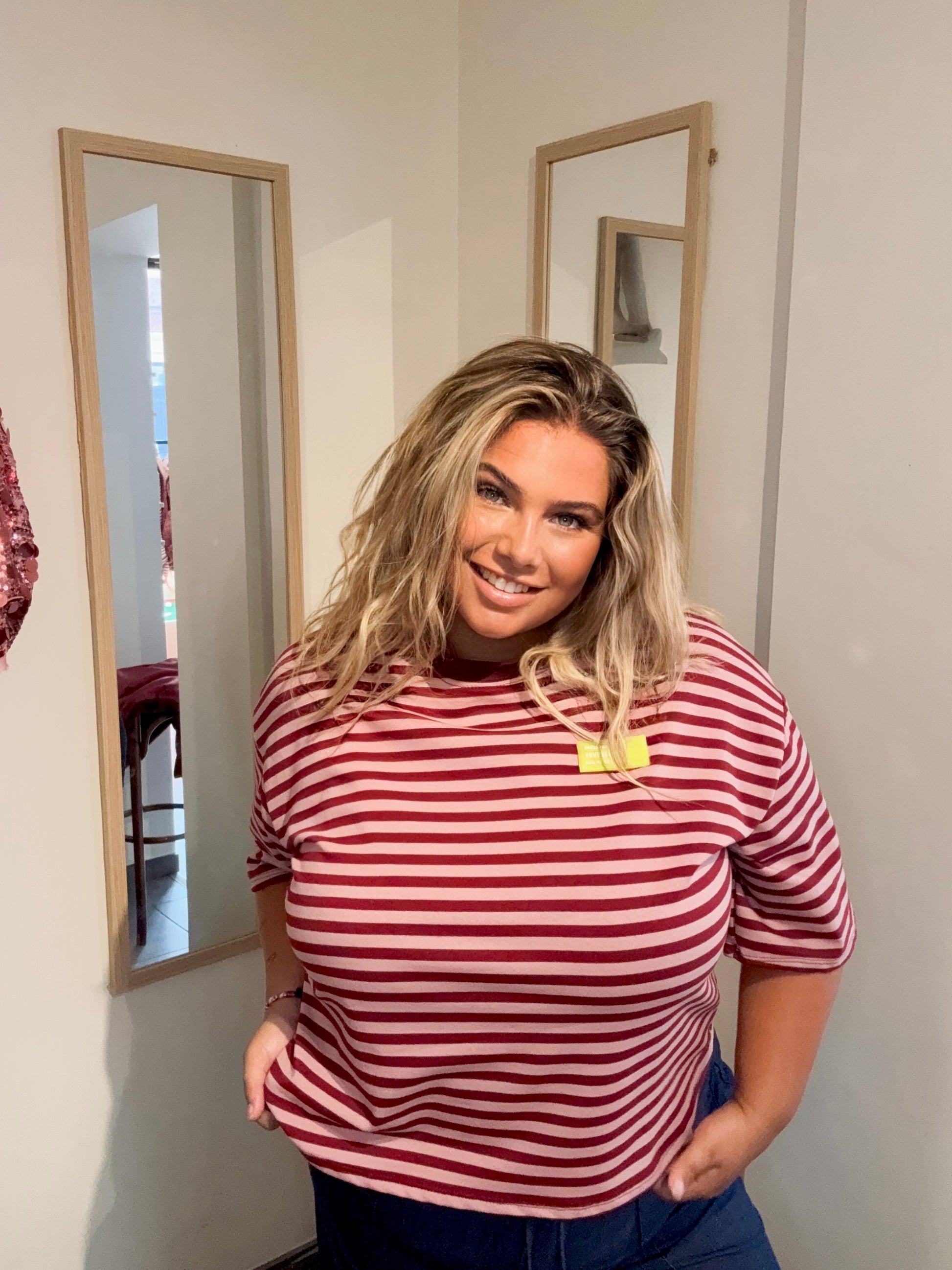 Un classique revisité pour un look casual et tendance. Ce t-shirt à rayures, disponible en rouge & blanc ou violet & bordeaux, combine confort et style grâce à sa coupe oversize et à sa matière douce.